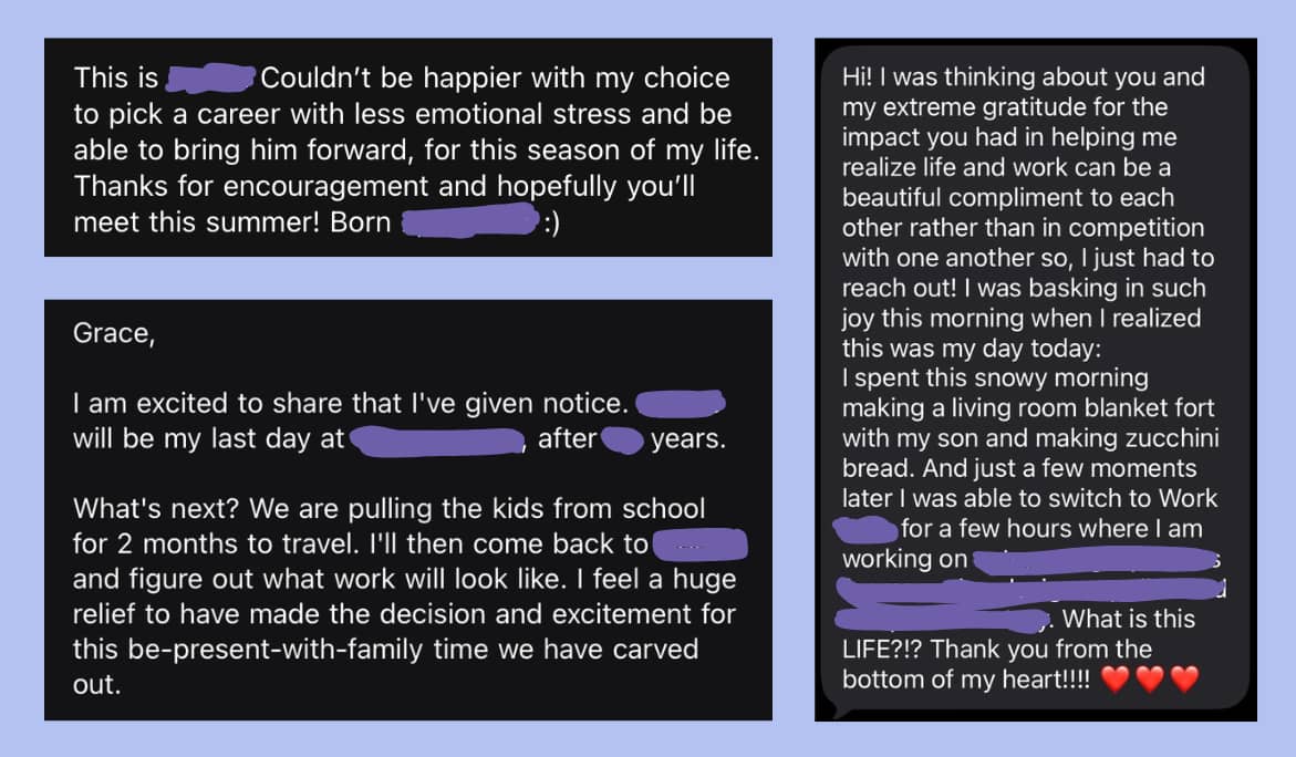 Man, if I could share this with 2021 Grace. She was lusting after this career in her journal... But designing a career you love isn’t just about flowy, feel-good work. It’s also about making an impact, funding your life, and having energy for non-work life. Let’s check in on that too: Impact Money Non-Work If it sounds like I’m flexing, I am. Because I’m here today thanks to people who had the audacity to flex and show me what was possible. Ready to design a career YOU love?A career with more flow, impact, money, and energy for non-work life? Reply to this email and let me know where you’re at and what you want. Or book an exploration chat so we can dive into your goals and make a plan. Onward! P.S. Because I refuse to proselytize some “perfect career” fantasy, here’s some non-flex-worthy stuff: